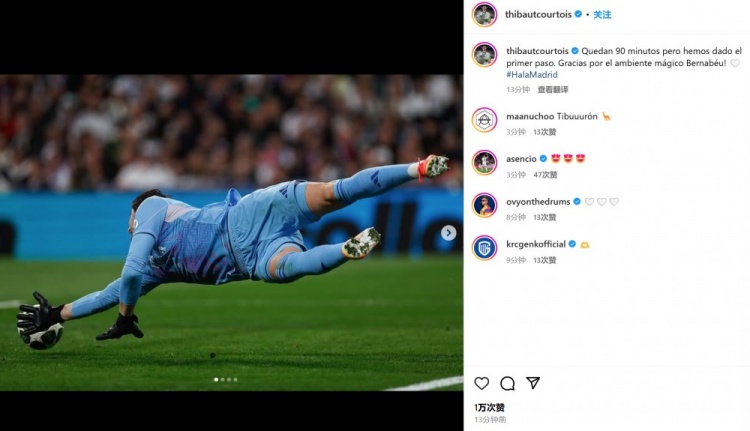 庫爾圖瓦曬出自己的撲救照,并配文:“還剩90分鐘,但我們已經(jīng)邁出了第一步。感謝球迷們在伯納烏營(yíng)造的神奇氛圍!”