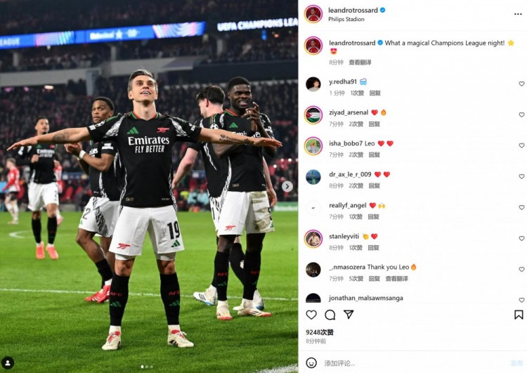 本場(chǎng)比賽特羅薩德首發(fā)出戰并取得進(jìn)球,賽后他也在個(gè)人社媒曬出慶祝進(jìn)球照片,配文寫(xiě)道:“多么神奇的歐冠之夜!”