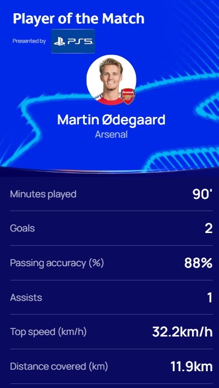 本場(chǎng)比賽厄德高發(fā)揮出色,打進(jìn)2球并有1次助攻,傳球成功率88%,跑動(dòng)距離達到11.9km,賽后他也當選歐冠官方本場(chǎng)最佳球員。