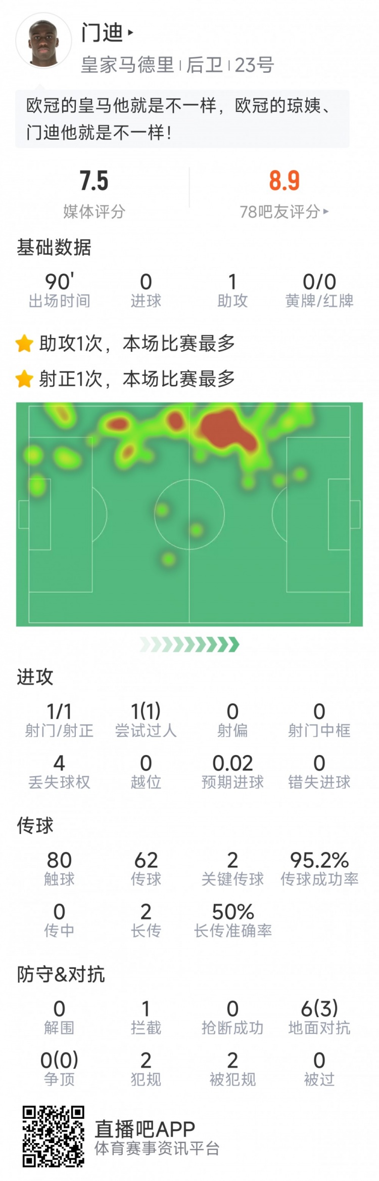 3月5日訊 在本輪歐冠皇馬2-1擊敗馬競的比賽中,門(mén)迪送出一次助攻,以下為他在本場(chǎng)數據: