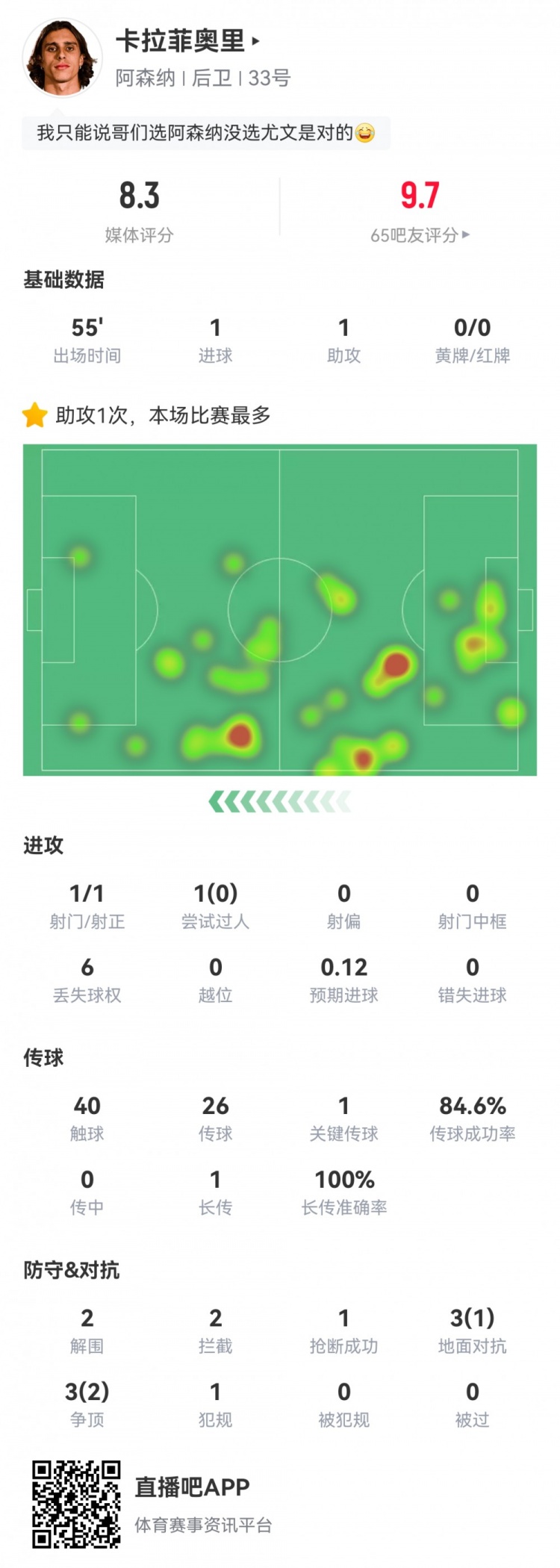 3月5日訊 歐冠1/8決賽首回合,阿森納7-1客勝埃因霍溫。此役卡拉菲奧里替補登場(chǎng)55分鐘,球員全場(chǎng)重點(diǎn)數據如下↓