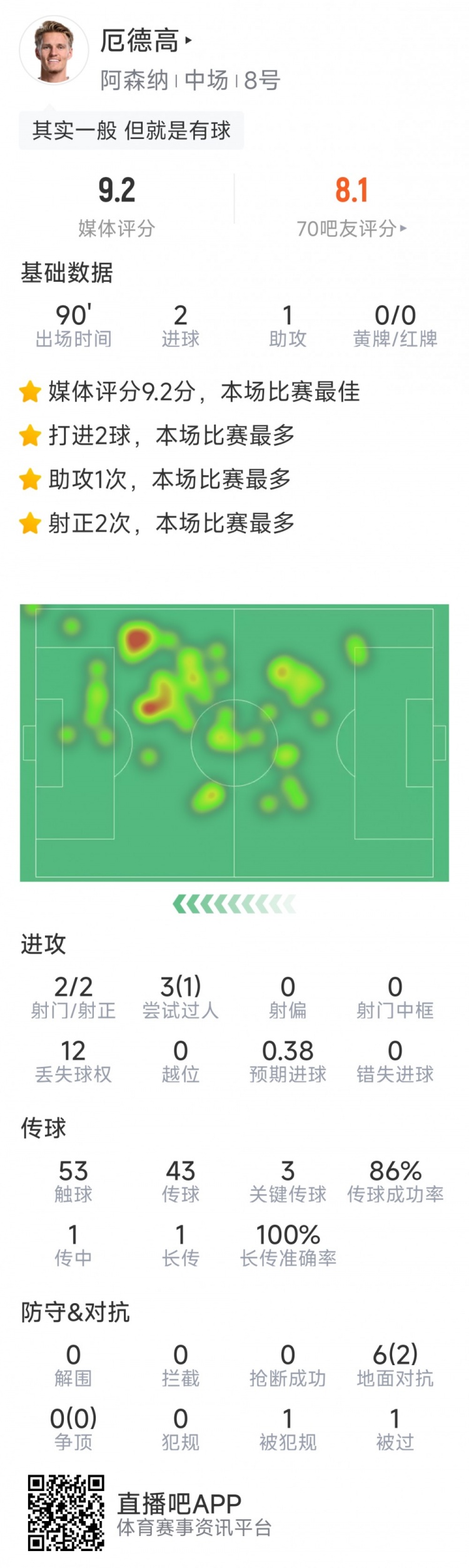 厄德高本場(chǎng)數據:2粒進(jìn)球,1次助攻,3次關(guān)鍵傳球,評分9.2分