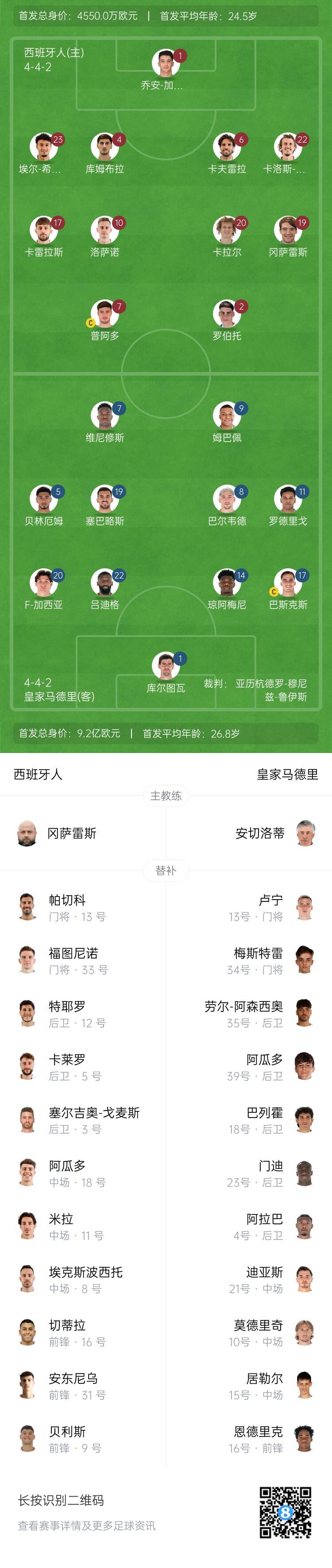 皇馬替補:13-盧寧、34-梅斯特雷、4-阿拉巴、10-莫德里奇、15-居勒爾、16-恩德里克、18-巴列霍、21-迪亞斯、23-費蘭-門(mén)迪、35-勞爾-阿森西奧、39-洛倫佐-阿瓜多